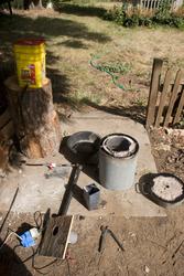 The basic idea is to blow air into whatever it is you’re burning. In my case, I start with some charcoal, maybe 10 or 15 pieces. If you look closely at the picture on the right, you’ll notice a length of 1/4″ copper tubing sticking out both ends. The two bolts you see and one that you don’t hold the tubing centered. The left end is connected to some plastic tubing, through a valve to the kitty litter bucket on the chopping rounds. To connect to the kitty litter bucket, I simple drilled a hold a little smaller than the 3/8″ nipple (I wrote nipple, huh huh)